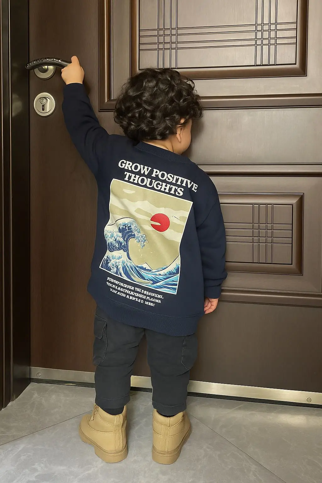 سويت شيرت أطفال أنيق بلون كحلي داكن بتصميم فني مميز من الخلف، يضم طبعة موج بحر وعبارة تحفيزية تعبر عن الطاقة الإيجابية والانطلاق. خامة قطنية ناعمة تمنح الدفء والراحة، لتجمع بين الأسلوب العصري والإطلالة العفوية الأنيقة.