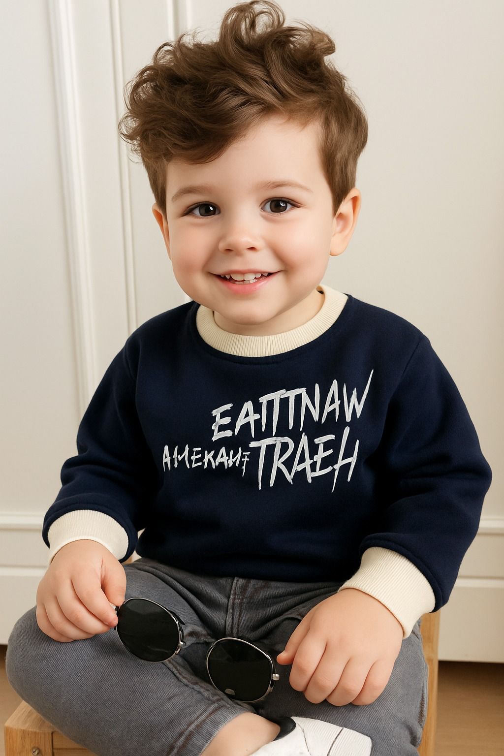 سويت شيرت أولادي كاجوال باللون الكحلي الغامق، بتصميم مطبوع باللون الأبيض يمنح إطلالة عصرية وأنيقة. مصنوع من خامة قطنية ناعمة ومريحة ليمنح طفلك الدفء والراحة في فصول الخريف والشتاء.