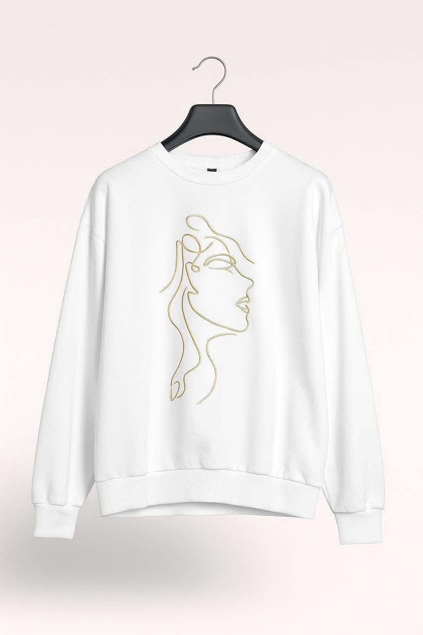سويت شيرت أبيض أنيق مطبوع بخط ذهبي لتصميم وجه فني يعكس الذوق الرفيع والإطلالة الراقية. يأتي بخامة قطنية ناعمة توفر الراحة والدفء مع تصميم أنثوي عصري يناسب مختلف الإطلالات اليومية والمواسم.