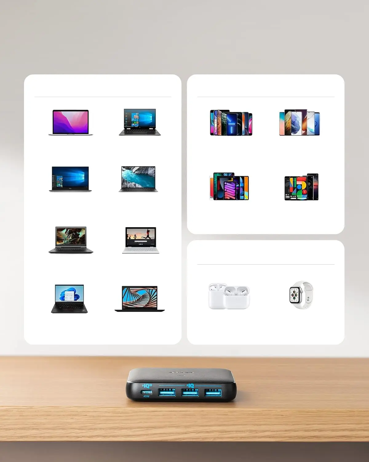 يدعم تقنية PowerIQ 3.0 التي توفر سرعة شحن مثالية لكل جهاز، بينما يضمن التصميم النحيف سهولة الحمل والتنقل. بفضل قوته بـ 65 واط، يمكنك شحن عدة أجهزة في وقت واحد بكفاءة وأمان.