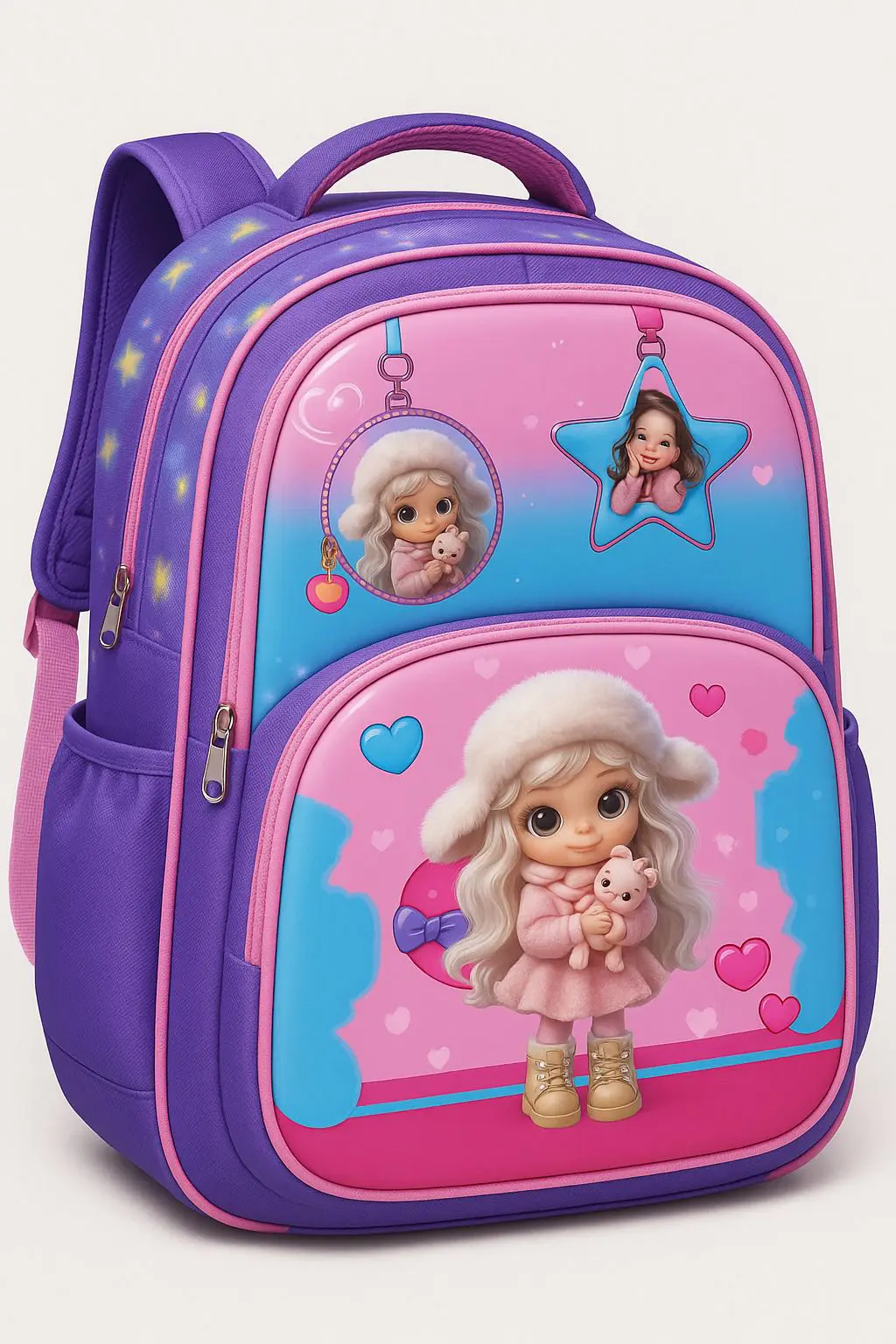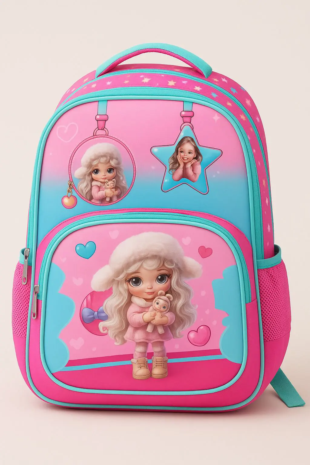 تتميز بتصميم دمية كرتونية لطيفة مع طبعات قلوب ونجوم جذابة، وألوان بينك وتركواز نابضة بالحياة.