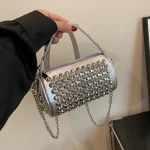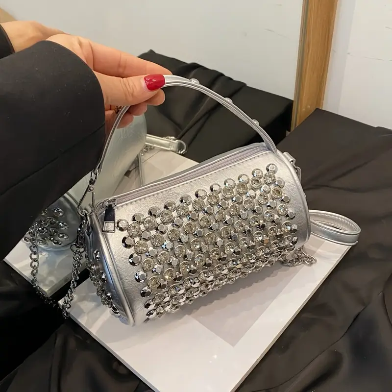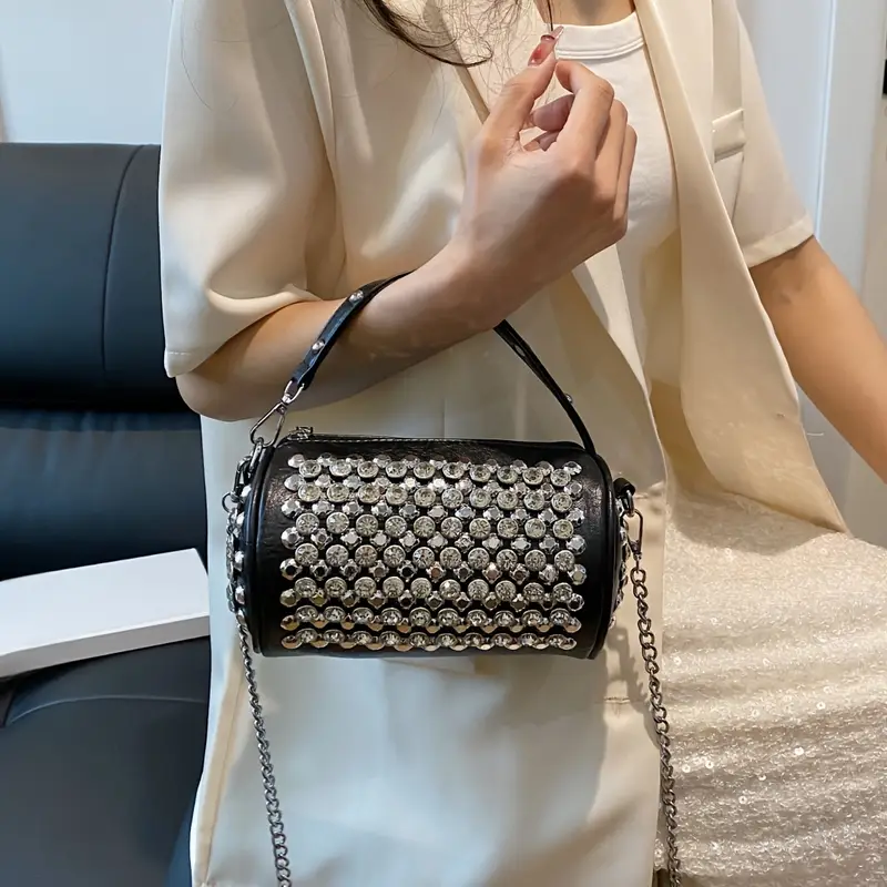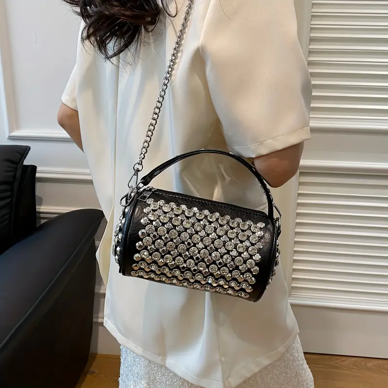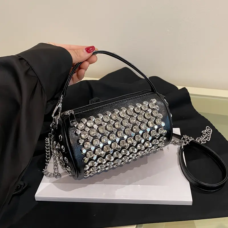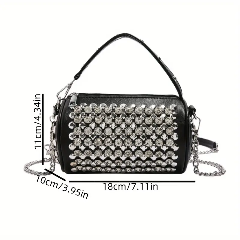 شنطة نسائية سوداء فاخرة مزينة بالراين اللامع بحزام كروسبودي قابل للفصل، حقيبة نسائية للمناسبات والسهرات