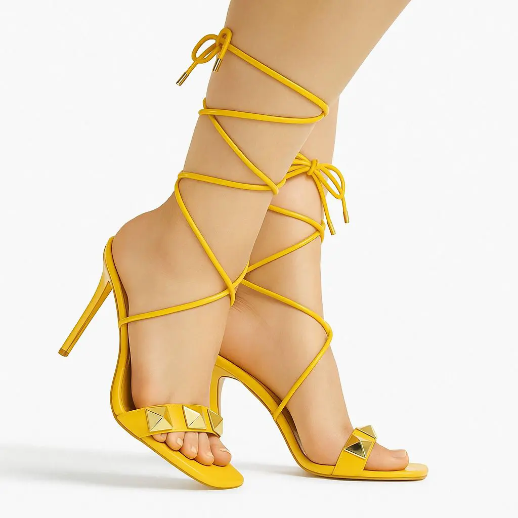 يعكس هذا الصندل النسائي من Cape Robbin روح التصميم العصري المتقن، حيث يجتمع الابتكار في التفاصيل مع الأناقة اللافتة. يأتي بلون أصفر زاهي يمنح إطلالتك حضورًا مميزًا، ويتميز برباط طويل يلتف حول الكاحل ومسامير هرمية ذهبية تضيف لمسة جريئة وراقية.
