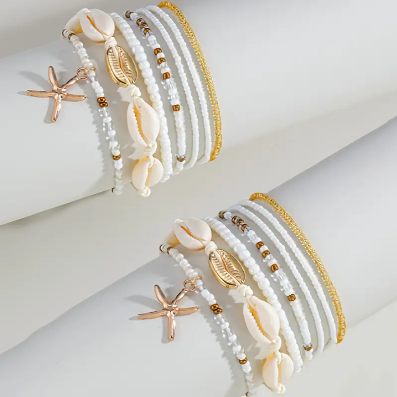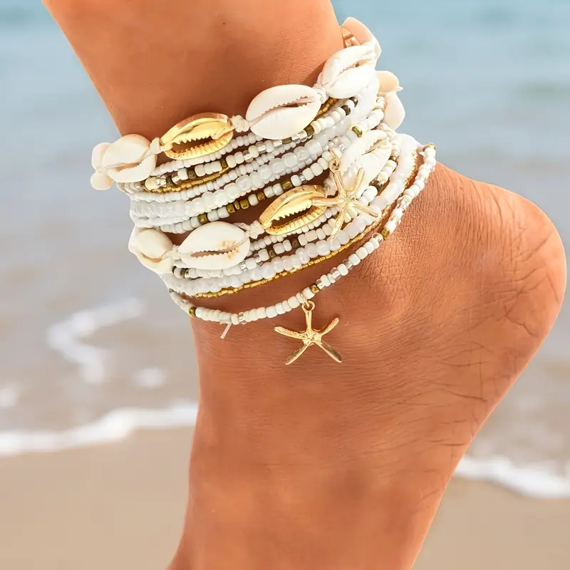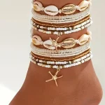 أضيفي لمسة أنثوية فريدة إلى إطلالتك الصيفية مع هذا الطقم الرائع من أساور الكاحل متعددة الطبقات. يتكون من 14 قطعة متنوعة تجمع بين سحر نجم البحر وتفاصيل الصدف الطبيعية، مع فواصل ذهبية أنيقة تضفي لمسة من التألق والتميز.