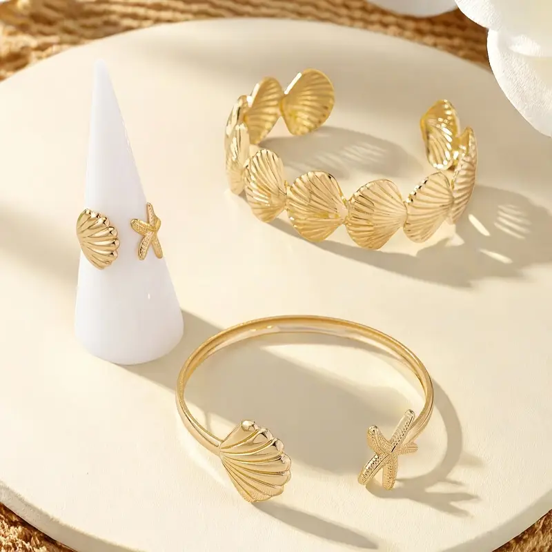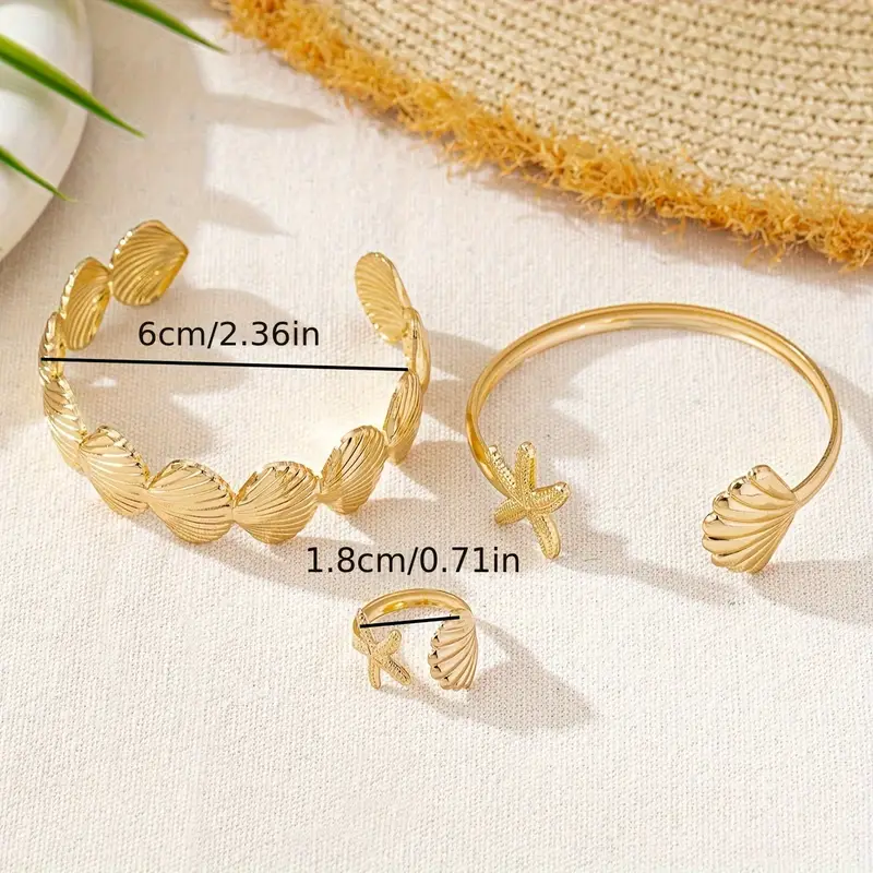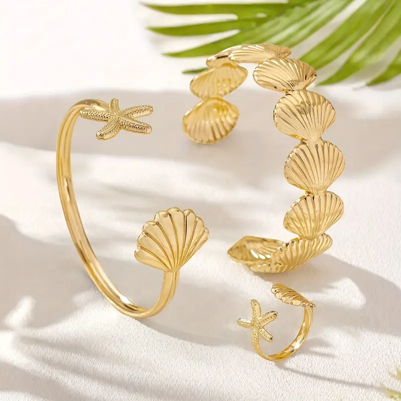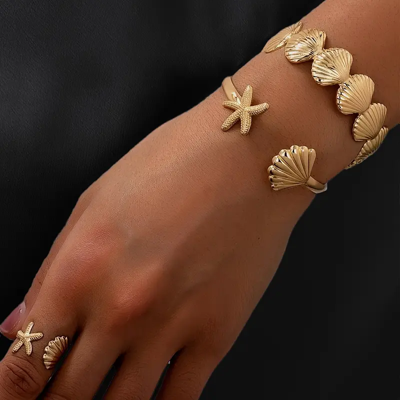 استمتعي بإطلالة صيفية ناعمة مع مجموعة الأساور المعدنية المصممة على هيئة نجمة البحر والقواقع البحرية.