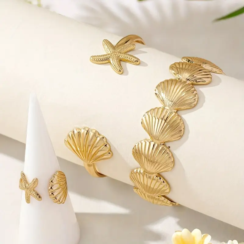 امنحي إطلالتك لمسة صيفية أنيقة مع مجموعة الأساور المعدنية المصممة بأشكال نجمة البحر والقواقع البحرية. تجمع هذه المجموعة بين البساطة الساحرة والتفاصيل المستوحاة من الطبيعة، مما يجعلها خيارًا مثاليًا للهدايا النسائية ولإطلالات حفلات الشاطئ المميّزة.
