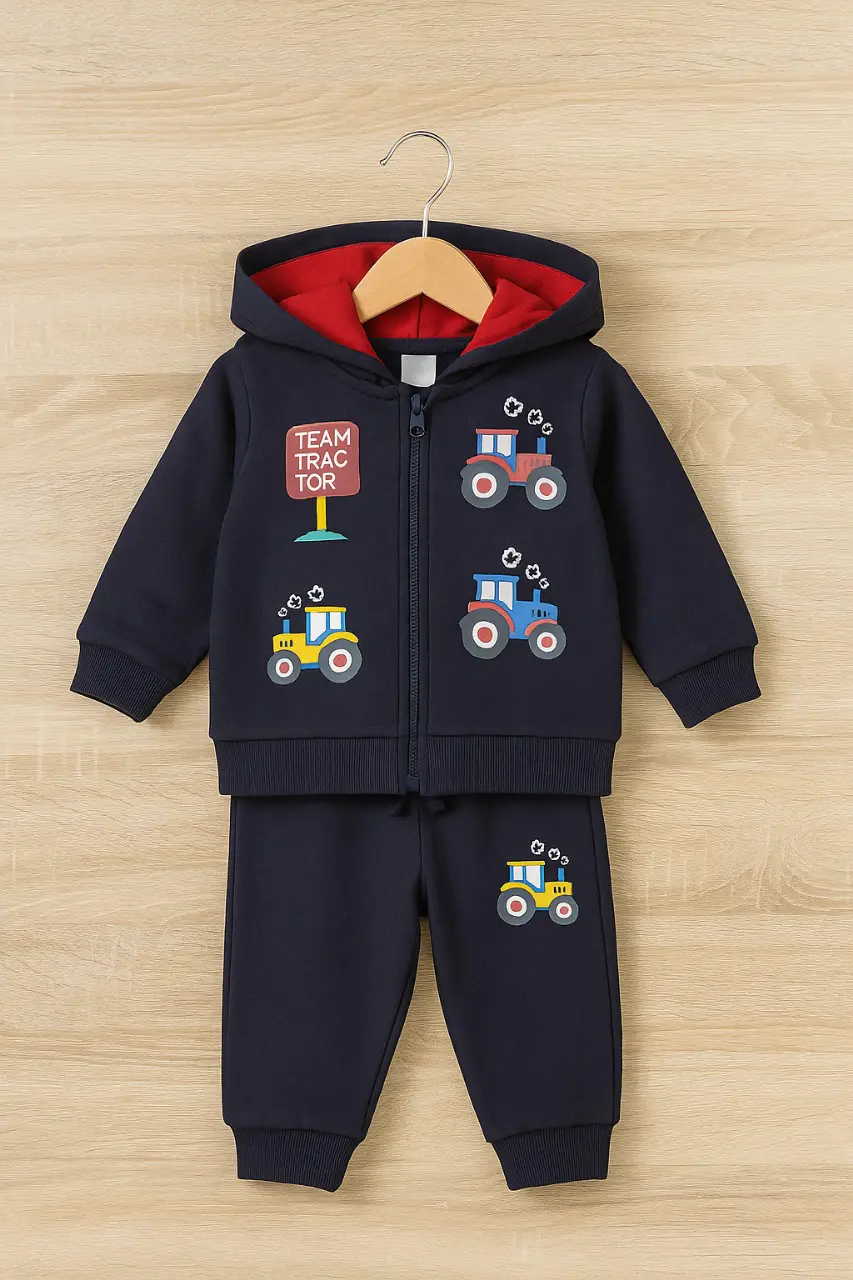 يضم الطقم سويت شيرت بسحاب يسهل ارتداؤه وخلعه، وبنطلون مريح بخصر مطاطي، مع طبعة سيارات الجرار الممتعة التي تضفي لمسة مرحة على الإطلالة.
