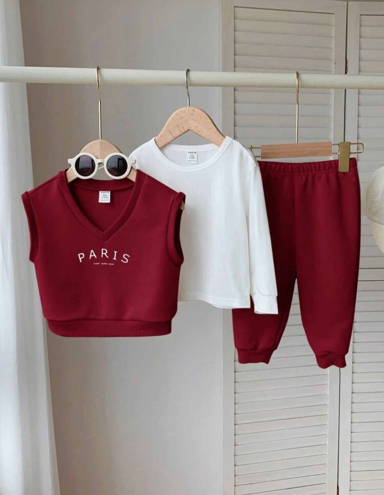 طقم أطفال 3 قطع أنيق باللون الخمري، تصميم كاجوال مستوحى من موضة باريس