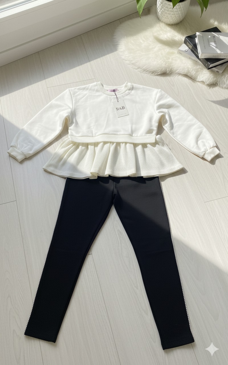 يُقدَّم هذا الطقم البناتي الأنيق بتصميم يجمع بين الرقة والراحة لإطلالة يومية جذابة. يتميز بتناسق الألوان الكلاسيكية بين الأبيض والأسود مع لمسات لامعة تضيف لمسة من الأناقة العصرية المناسبة للمناسبات الكاجوال والطلعات اليومية.
