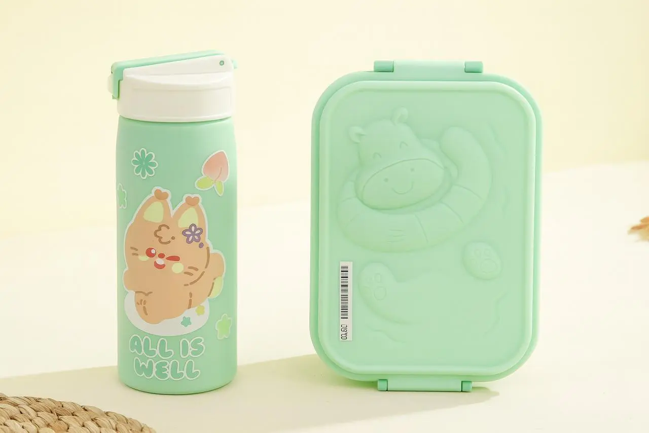 طقم لانش بوكس وزجاجة حرارية للأطفال بتصميم كرتوني، عملي وآمن للمدرسة والرحلات
