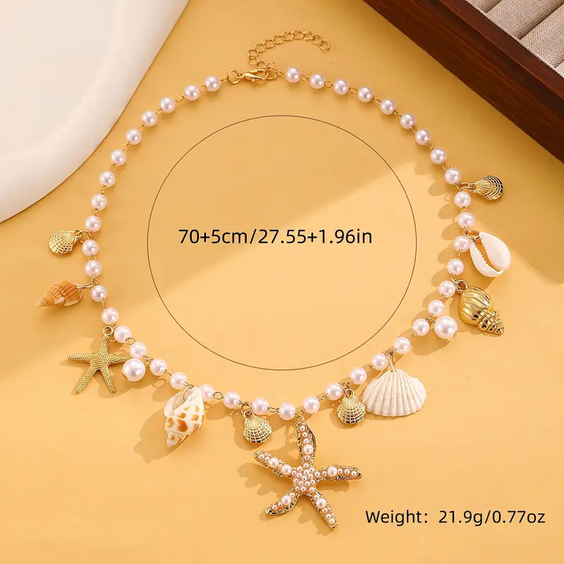 يجمع هذا التصميم بين الأناقة العفوية والجرأة من خلال سلسلة سميكة وزخارف نجم البحر المصنوعة من سبيكة ذهبية، مع لمسات من اللؤلؤ الصناعي والصدف الطبيعي.