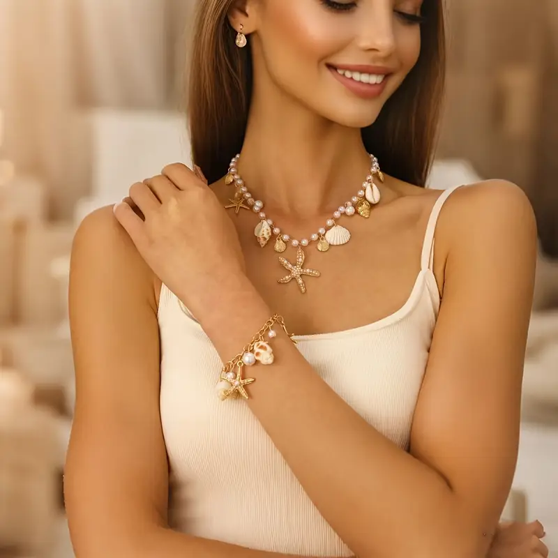 طقم مجوهرات نسائي بوهيمي للشاطئ والعطلات، قلادة وسوار بنجمة البحر والصدف