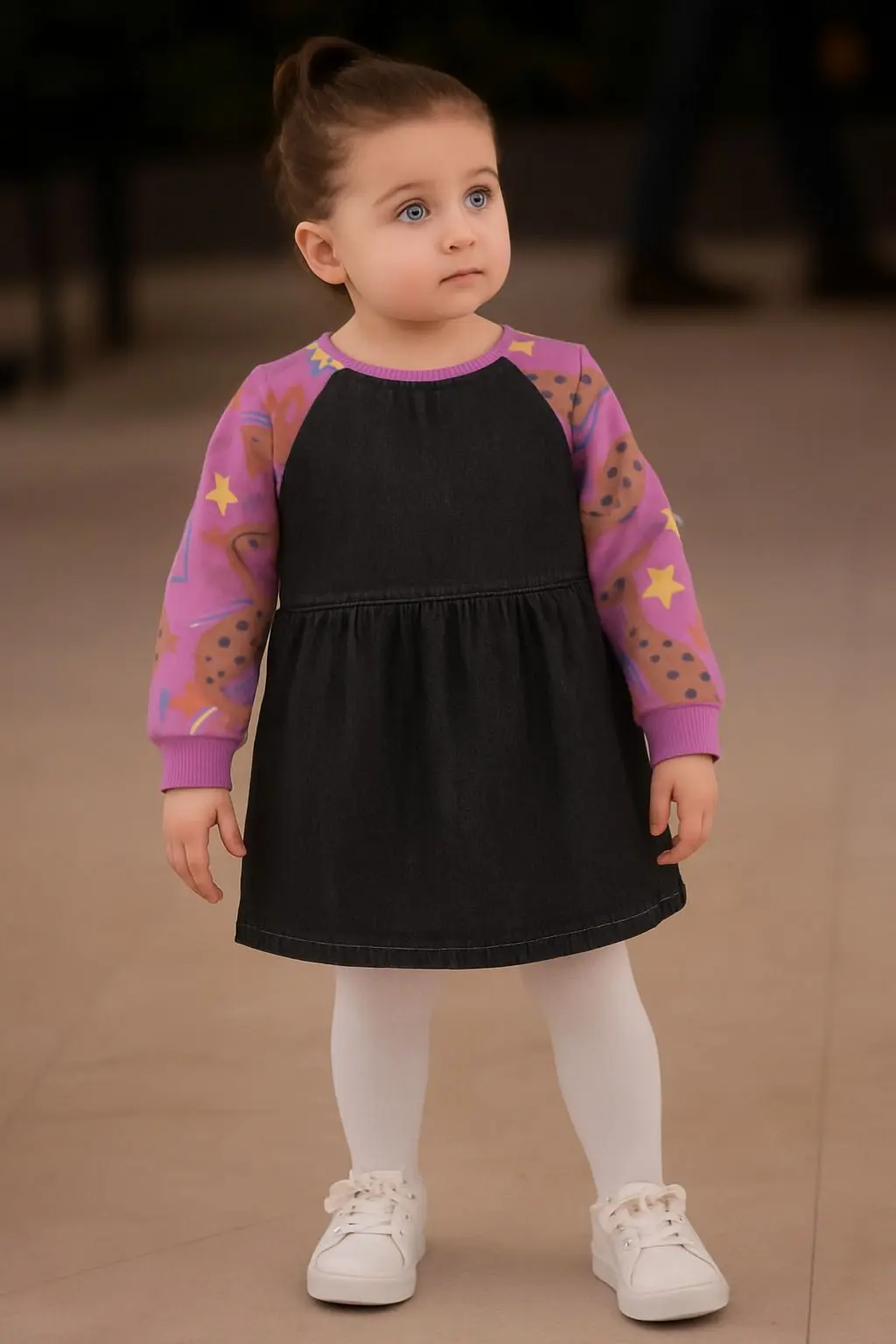 يأتي بتصميم مبتكر يجمع تنورة جينز داكنة تضيف لمسة كلاسيكية أنيقة، وبلوزة بأكمام مطبوعة بالنجوم والكوكيز تمنح طابعًا طفوليًا مليئًا بالحيوية.
