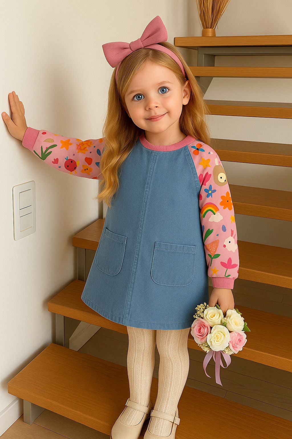 فستان بناتي بتصميم من قطعتين متصلتين يجمع بين الأناقة الكاجوال واللمسة الطفولية المرحة، حيث تأتي تنورة الجينز الفاتحة مع أكمام وردية مطبوعة برسومات كرتونية ملونة تضيف لمسة من الحيوية والبهجة لإطلالة الفتيات الصغيرات.