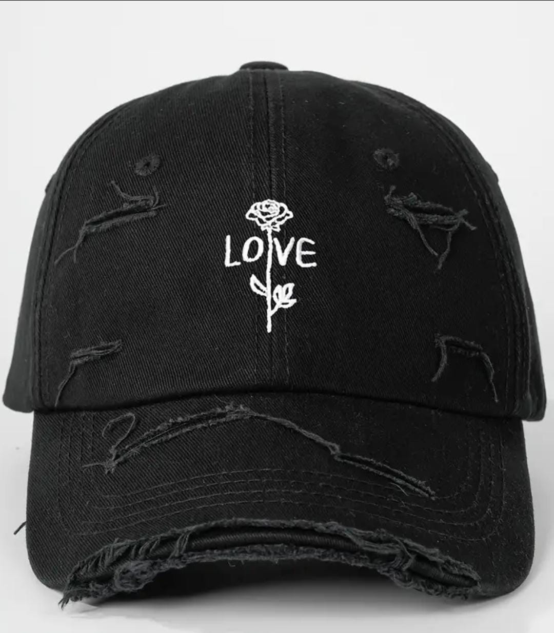 تألقي بإطلالة مميزة تجمع بين الأناقة والراحة مع قبعة البيسبول البيضاء المطرزة بتصميم وردة وكلمة “LOVE”.