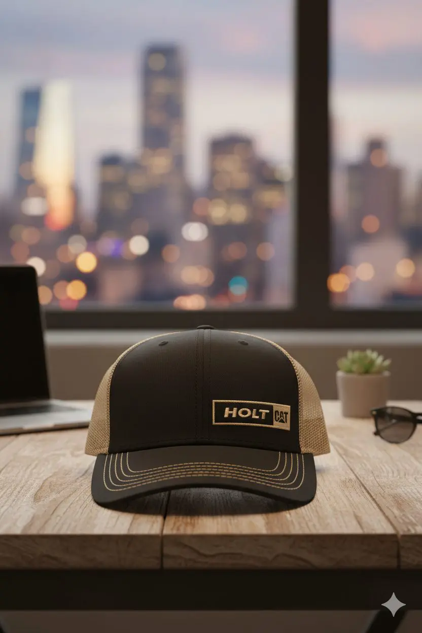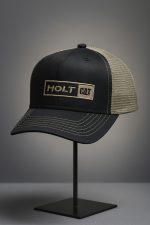 قبعة تروكر احترافية وأنيقة، تتميز بشعار HOLT CAT المطبوع أو المطرز. مقدمة سوداء داكنة مع شبكة وحافة باللون البيج/البني الفاتح. خياطة متباينة باللون الذهبي. مثالية للمحترفين وعشاق العلامات التجارية الثقيلة. مقاس قابل للتعديل