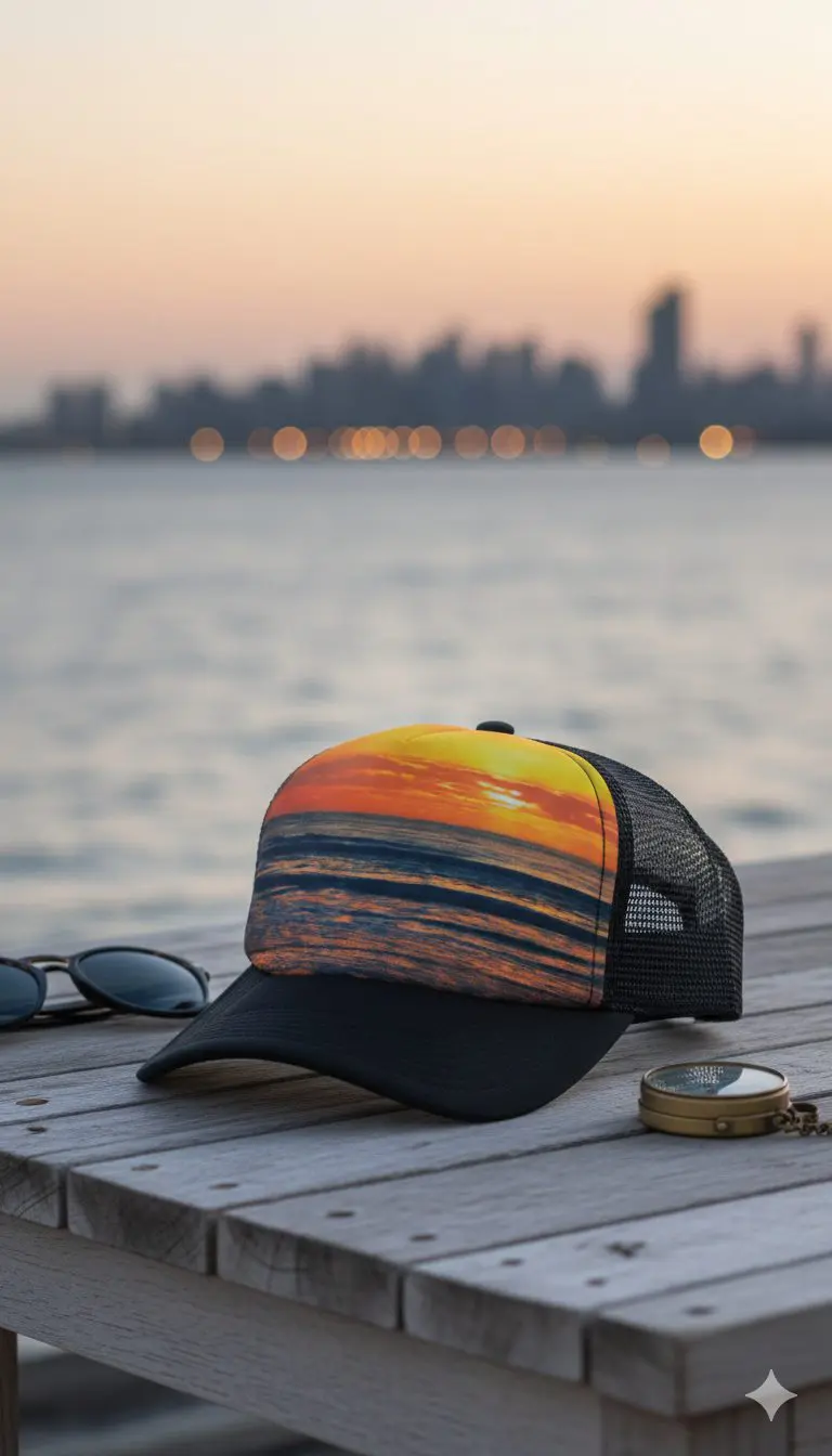 قبعة تروكر شبكية بطبعة الغروب – ستايل شاطئي ومغامرات (Sunset Seascape)
