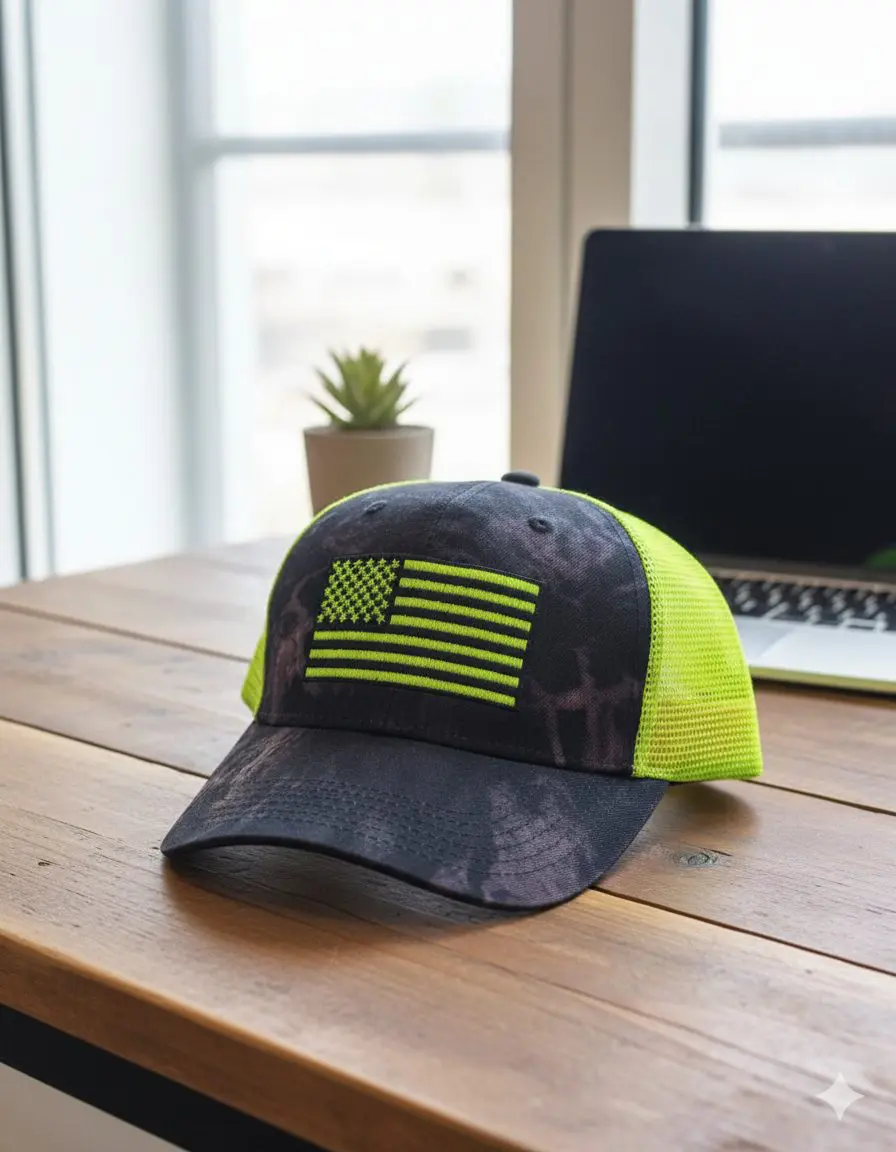 قبعة تروكر (Trucker Hat) العلم الأمريكي الفوسفوري – تصميم أسود ونيون جريء