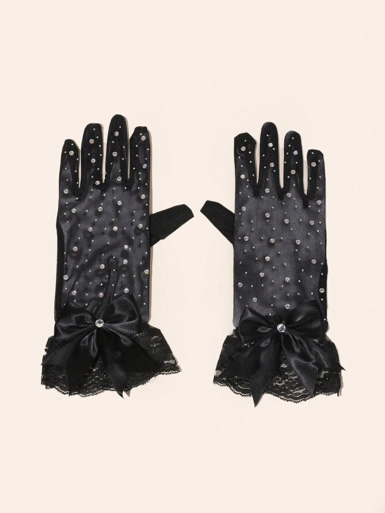 نُقدّم لكِ زوجًا من القفازات القصيرة المصمّمة بدقة وأناقة، والمزينة بالكريستالات اللامعة (Rhinestones) والدانتيل الناعم وربطة فيونكة أنثوية راقية. قطعة إكسسوار تضيف لمسة من الفخامة والرقي إلى مناسباتك الخاصة وإطلالاتك الراقية.