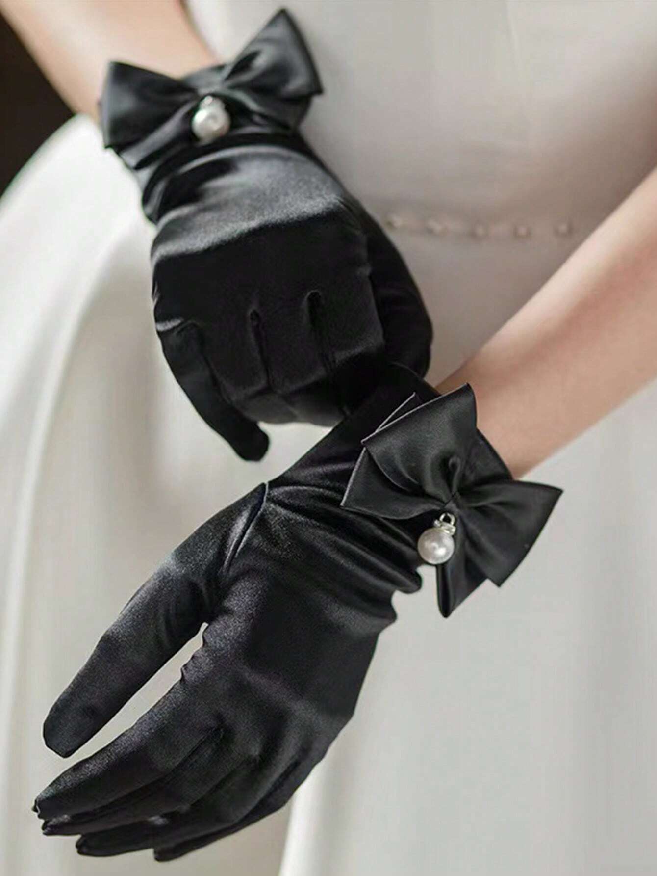 هذه القفازات المصنوعة من الساتان الناعم والمزين بلؤلؤ صناعي أنيق مع ربطة فيونكة كلاسيكية صممت خصيصًا لتكمل فستان الزفاف أو فساتين المناسبات الرسمية.