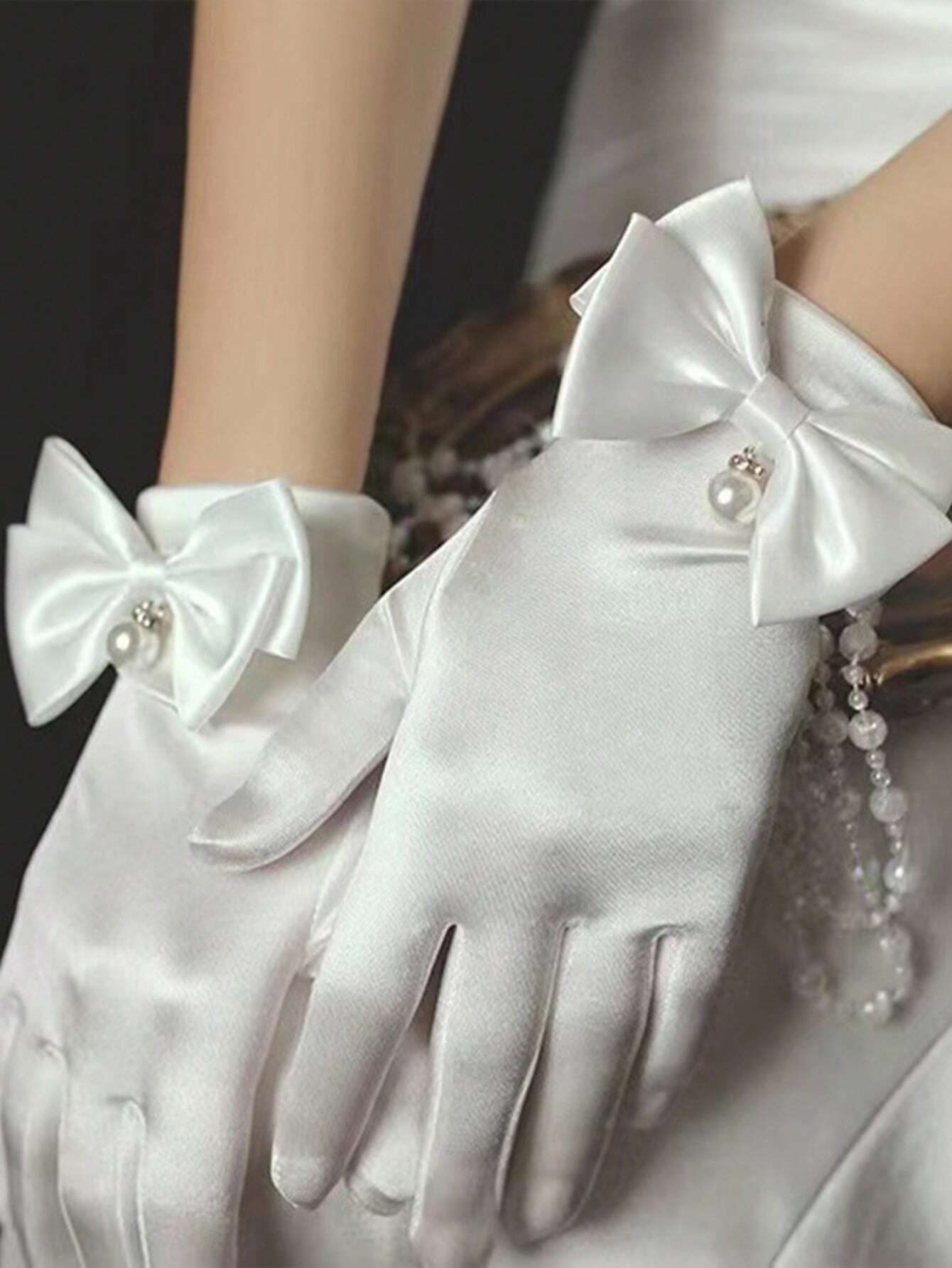 قفازات ساتان نسائية مزينة بلؤلؤ وفيونكة للزفاف والسهرات، إكسسوار فاخر للعرائس