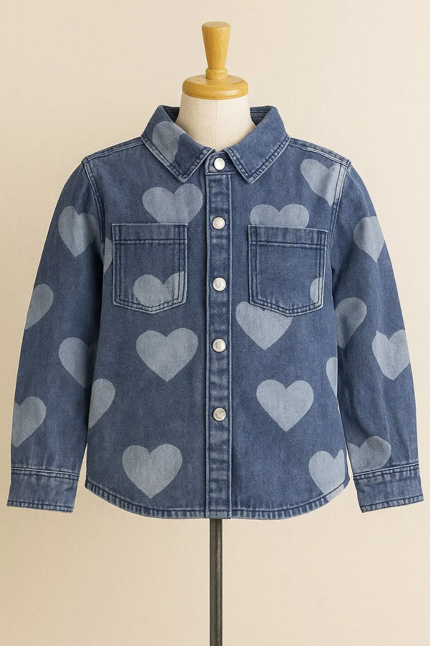 قميص جينز أطفال بنقشة قلوب، تصميم كاجوال أنيق للبنات، مناسب للإطلالات اليومية والكاجوال المدرسية