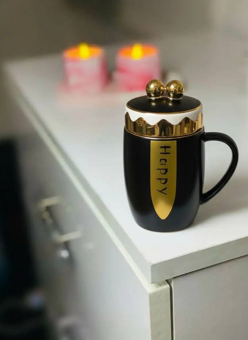 كوب خزفي فاخر أسود بغطاء ذهبي وكلمة Hoppy، تصميم أنيق يحافظ على حرارة المشروبات
