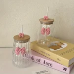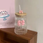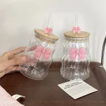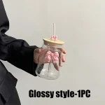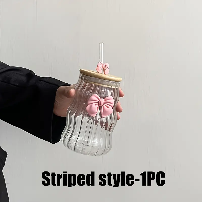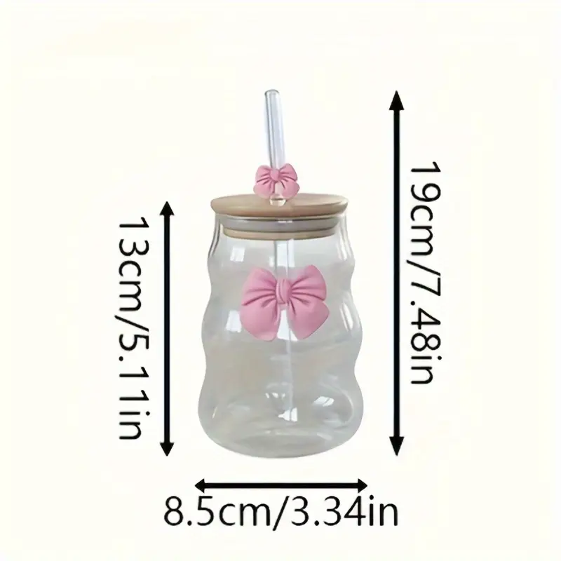 كوب زجاجي مزخرف مع فيونكة وشفاط، هدية مثالية للمناسبات ومشروبات القهوة والعصير