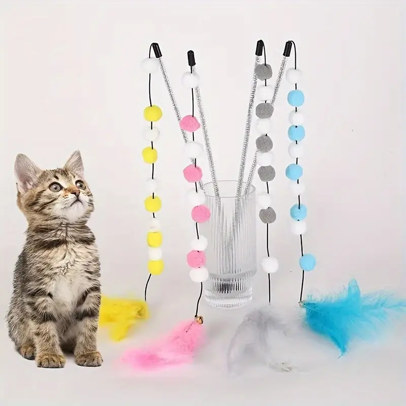 لعبة القطط التفاعلية مكون من 1 عصا ، عصا تحفيز القطط الملونة مع كرات قطيفة وجرس