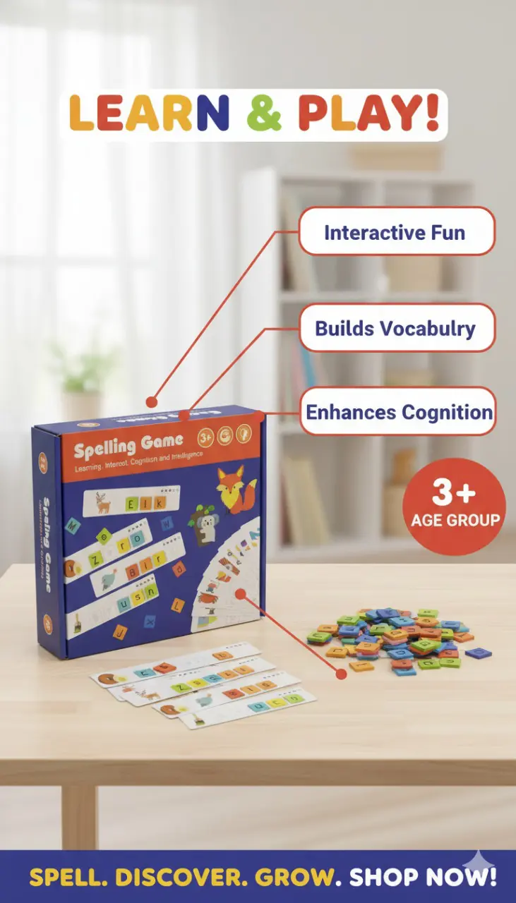 اجعل التعلم تجربة ممتعة لطفلك مع لعبة تعليم الحروف والكلمات التفاعلية التي تمكّنه من تعلم التهجئة والتعرف على الكلمات بطريقة محفزة ومسلية.