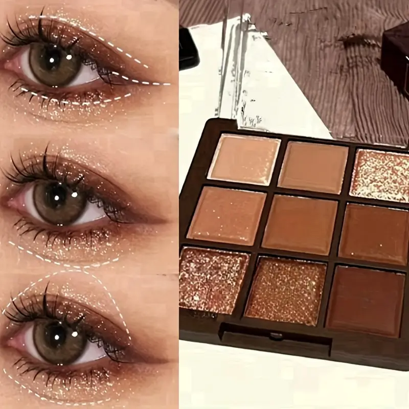 • بني داكن وذهبي: تحتوي اللوحة على ظلال بدرجات بني داكن تعطي عمقاً للعيون، بالإضافة إلى لمسات ذهبية دافئة تضفي بريقاً وأشعاعاً على الجفن.