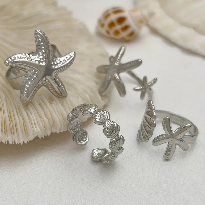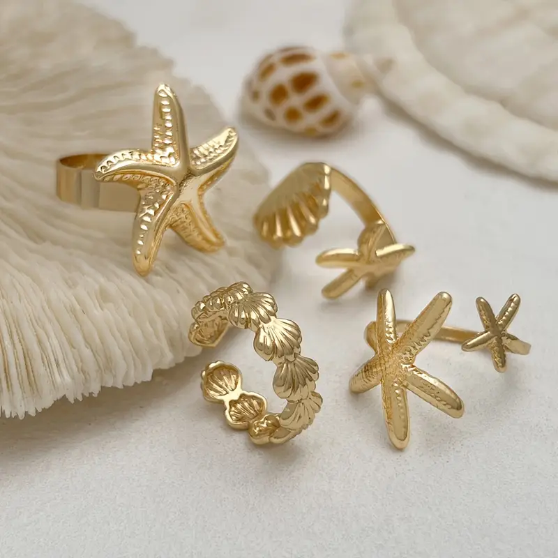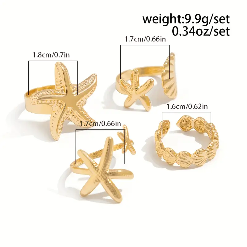 مجموعة خواتم نجمة البحر بوهيمية، 4 قطع من سبيكة الزنك لإطلالات الصيف والمناسبات