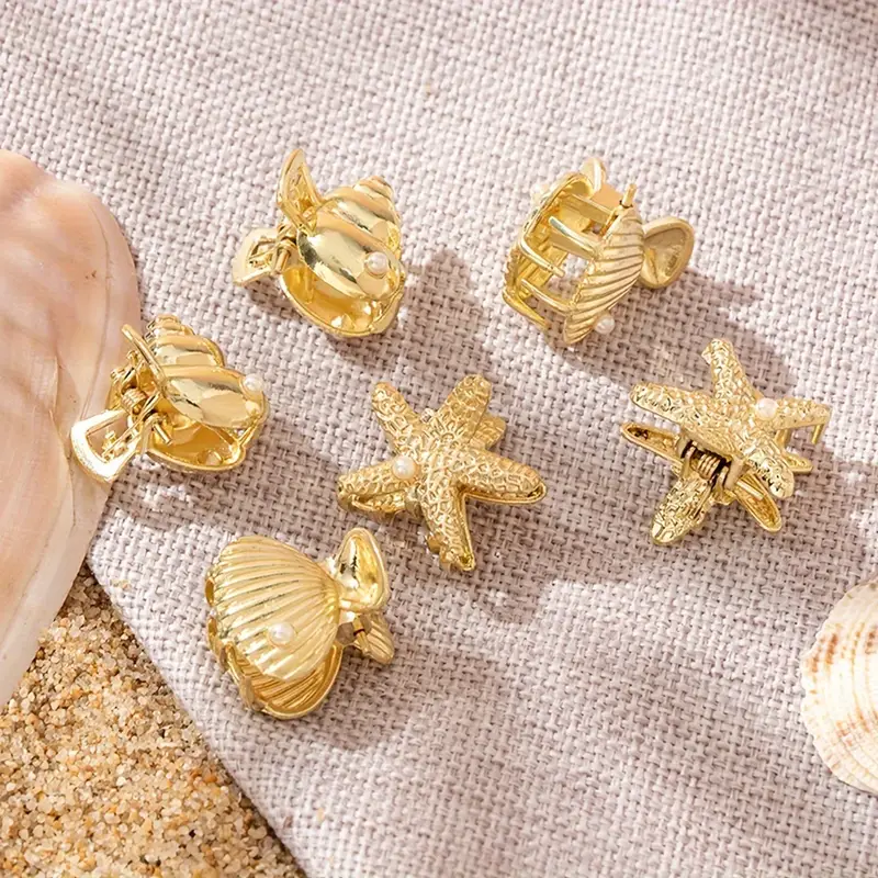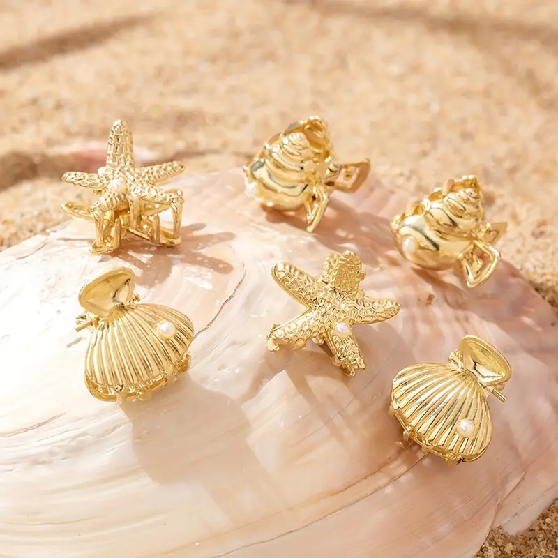 تألقي بتفاصيل مستوحاة من الطبيعة البحرية مع مشابك الشعر المعدنية المصممة على شكل نجمة البحر والمزينة بصدف أنيق.