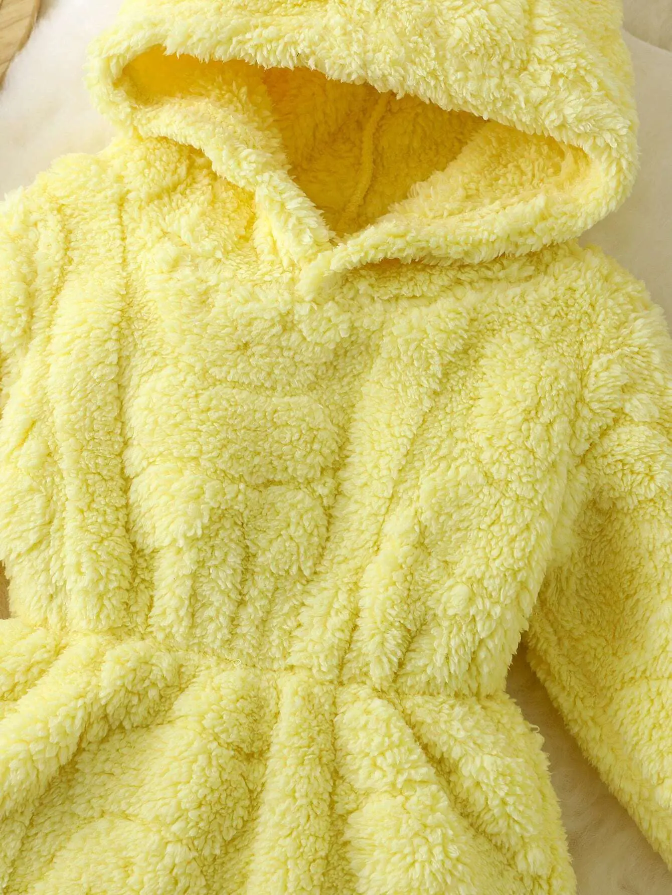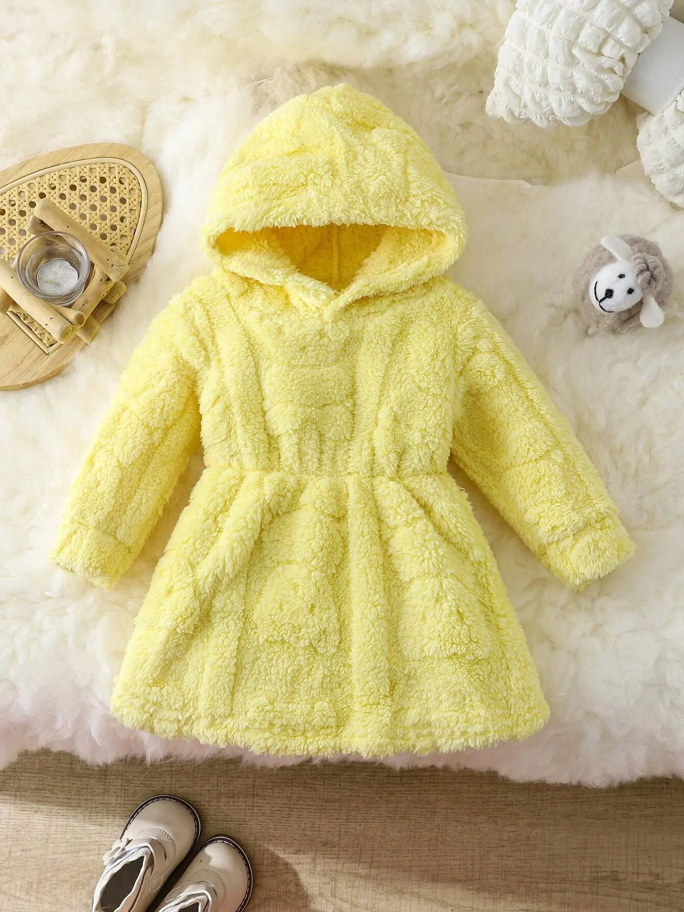 معطف فرو شتوي بناتي بقبعة، خامة فاخرة ولون أصفر باستيل، تصميم ناعم الملمس مريح للارتداء اليومي