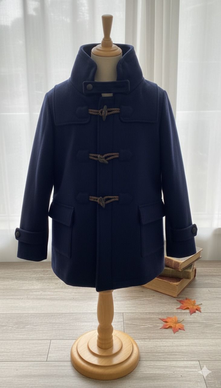 يتميز بلونه الكحلي العميق الذي يعكس الذوق الراقي، وتفاصيله الدقيقة مثل الأزرار الخشبية والأطراف المطوية التي تضفي لمسة مميزة.