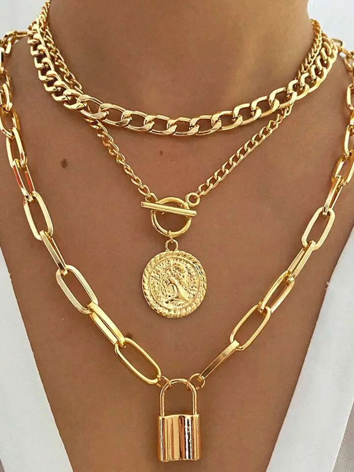 3pcs thick chain necklace with buckle 3pcs multi layer necklace set Of coins with bead clasp for women,