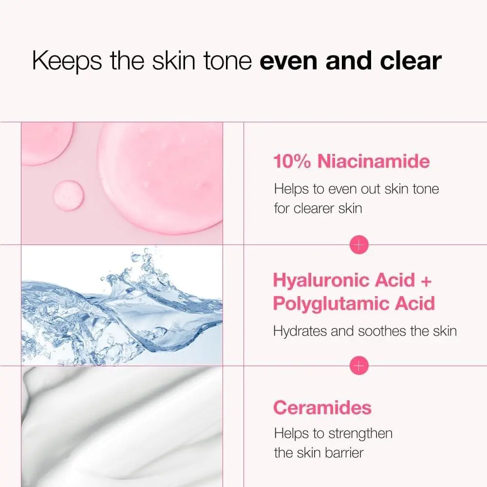 - النياسيناميد هو شكل من أشكال فيتامين ب3، ويشتهر بقدرته على توحيد لون البشرة وتحسين مرونتها.