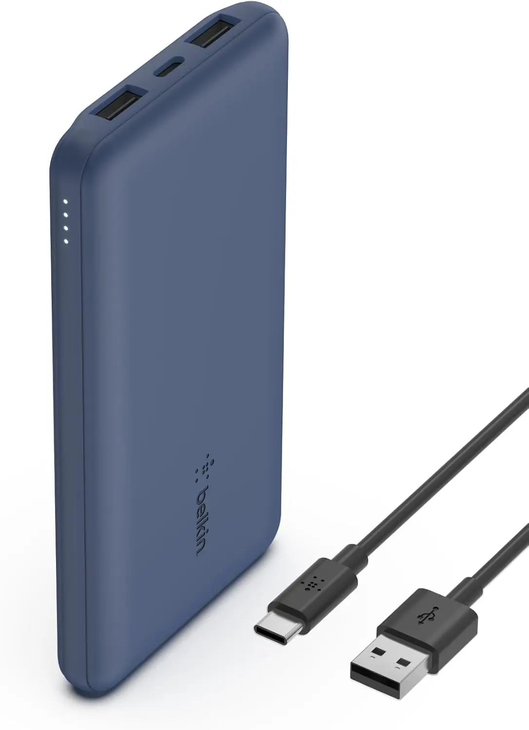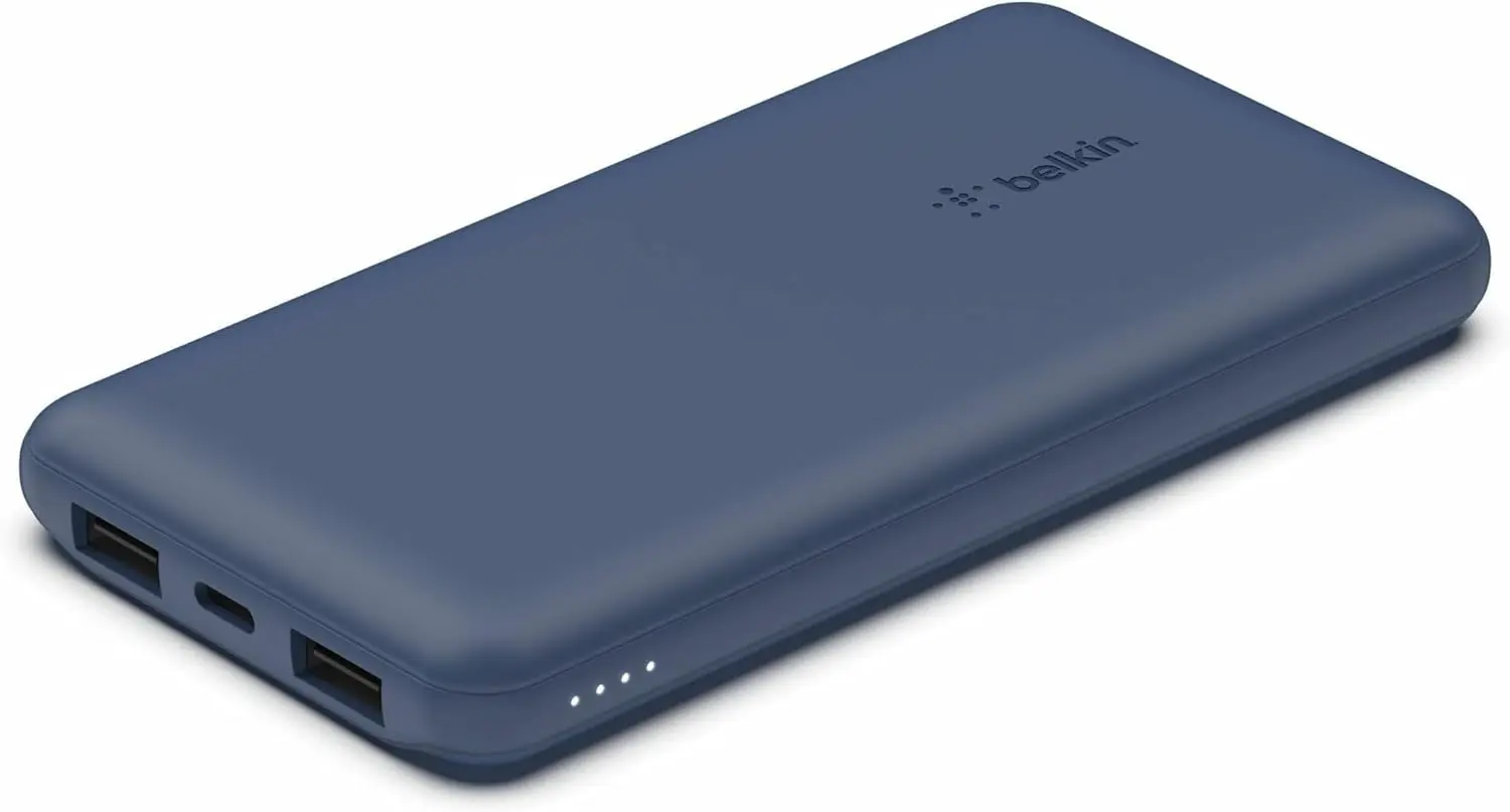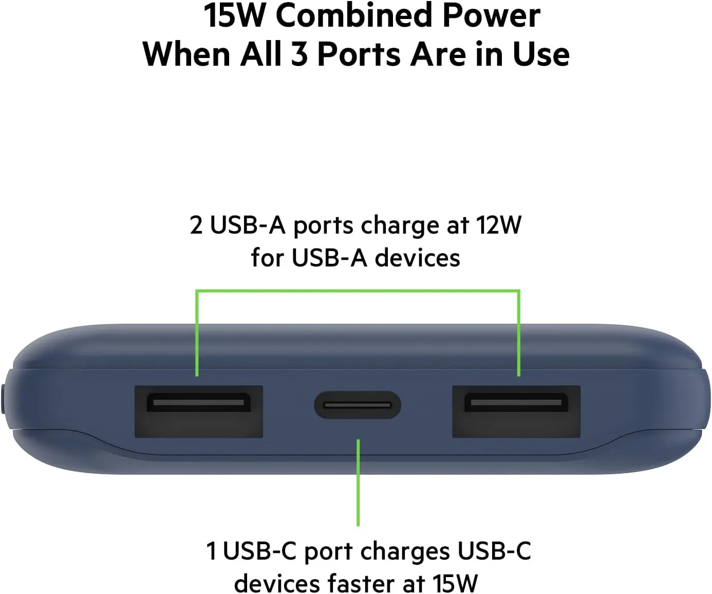 Belkin 10000mAh portable power bank, 10K USB-C portable charger with 1 USB-C port and 2 USB-A ports, battery pack for up to 15W charging for iPhone, Samsung Galaxy, AirPods, iPad, and more – Blue