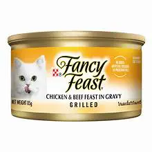 طعام قطط فانسي فيست (Fancy Feast) نكهة الدجاج والبقر المشوي في الصلصة (Grilled Chicken & Beef Feast in Gravy) هو طعام رطب فاخر مقدم للقطط يتميز بمزيج لذيذ من الدجاج المشوي ولحم البقر في صلصة غنية ولذيذة. هذا المنتج يهدف إلى تلبية احتياجات القطط الغذائية اليومية بطريقة مغذية ولذيذة.