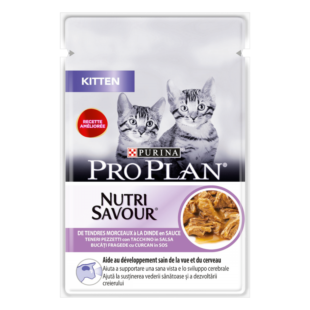 Purina Pro Plan NutriSavour Kitten Turkey in Gravy is a complete and balanced wet food specifically formulated for kittens aged 6 weeks to 12 months