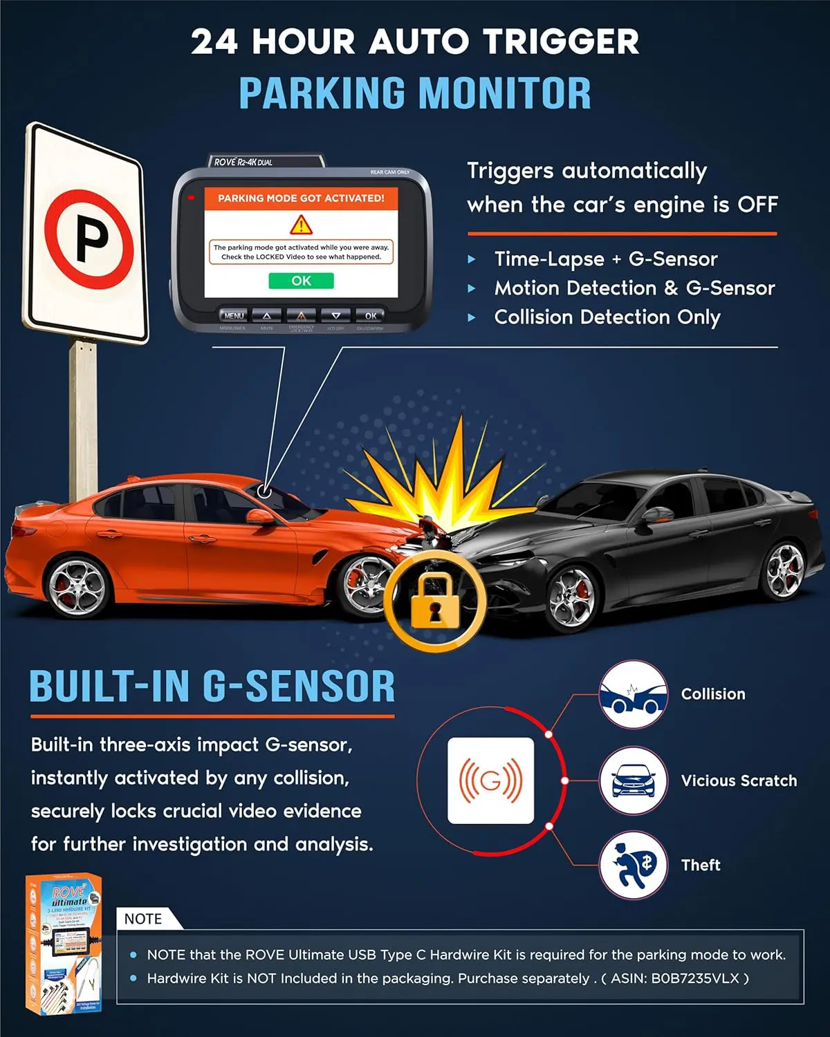 - Our 24/7 CUSTOM DESIGNED PARKING MODE – R2-4K DUAL offers three options for its custom-designed 24hr parking mode with voice guidance. 1fps timelapse video, motion detection, and collision detection. A hardwire kit is required (buy separately, ASIN: B0B7235VLX). If an event occurs in the park, then the camera will record a full 1-min video, lock it safely in an event folder, and give you a voice alert the next time you start your car letting you know that event has occurred while you were away.