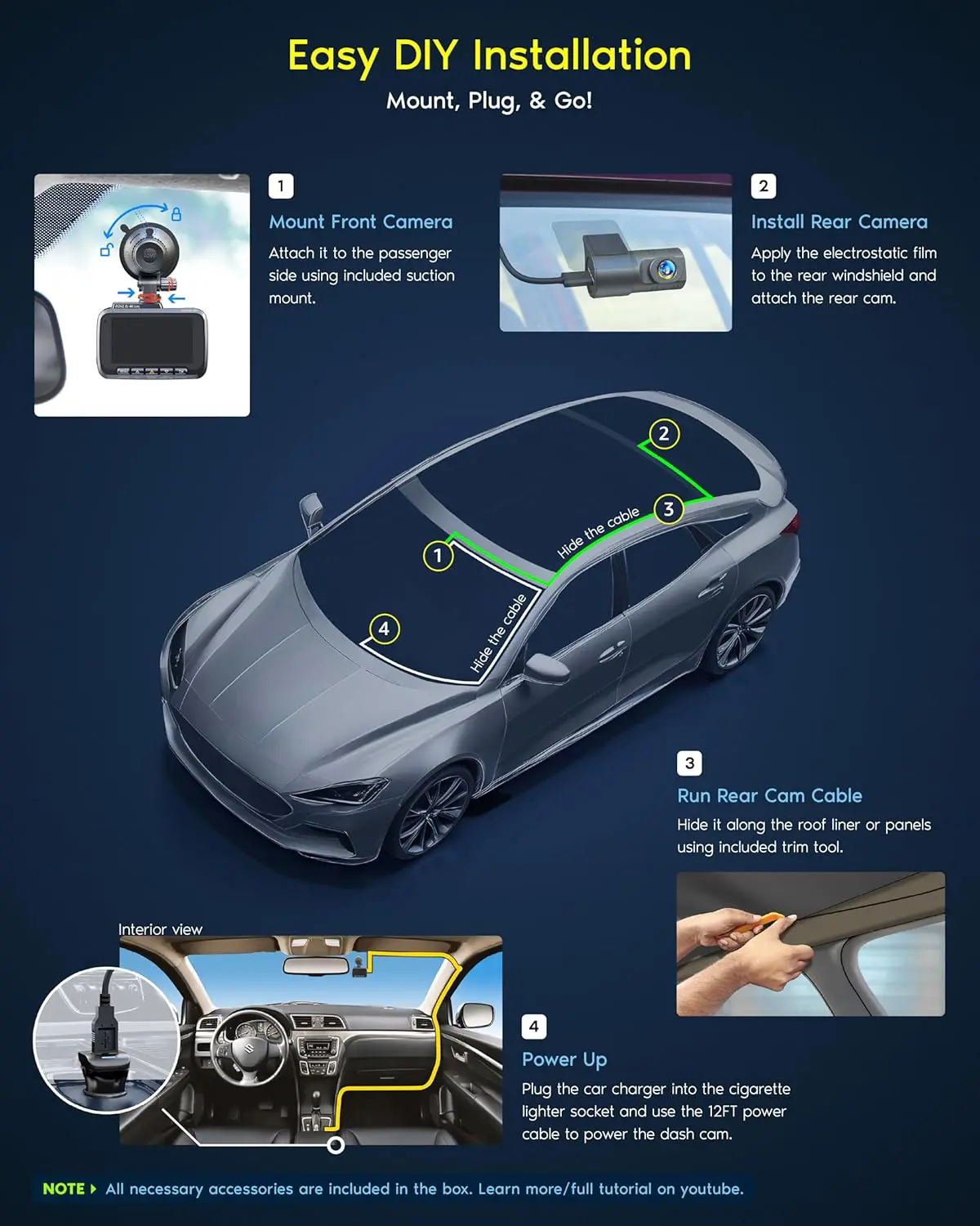 - 4K FRONT + 1080P REAR RECORDING – ROVE R2-4K DUAL dash cam offers dual-channel recording capabilities, capturing footage simultaneously from both the front and rear cameras. The front camera records at 3840x2160P @30fps, while the rear camera captures 1920x1080P @30fps footage, ensuring clear recordings of the road ahead and behind you. With a 150° ultra-wide angle for the front camera and a 140° angle for the rear camera, you’ll capture more of the road with this 4k dash cam.