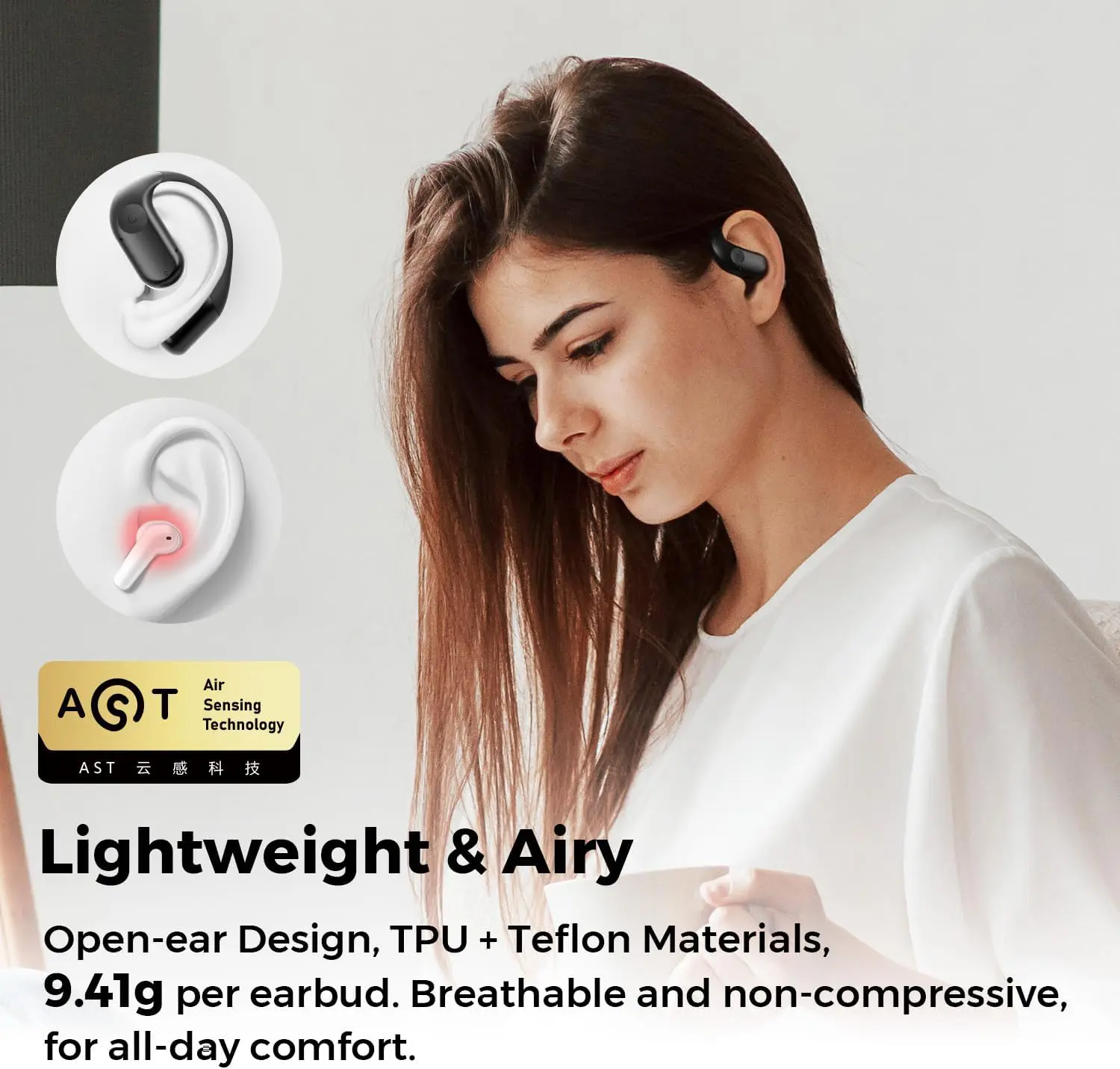 - 【Open-Ear Comfort & Awareness 】Experience lightweight comfort with SoundPEATS ChatFree Open-Ear Headphones, featuring ergonomic earhooks made of breathable TPU+Teflon (9.41g per earbud). The open-ear design bluetooth headphones eliminates ear canal pressure, keeping you aware of your surroundings for outdoor safety and all-day wear.