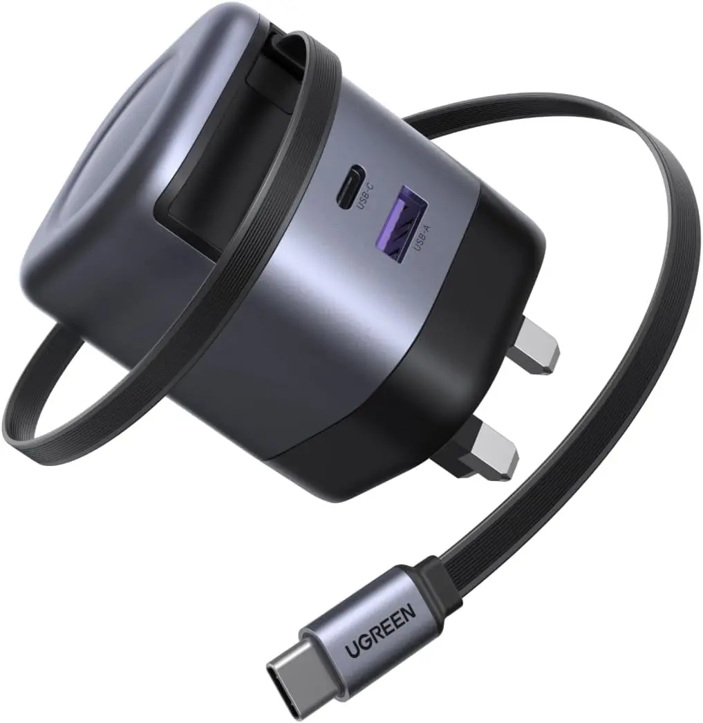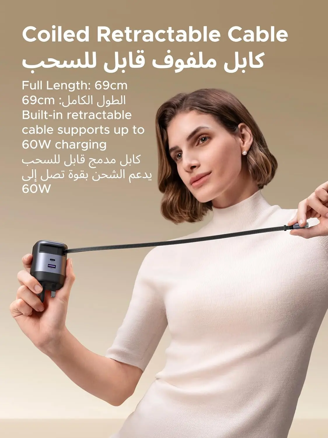- 【Grab & Go Built-in Retractable Cord】UGREEN 65W GaN USB C iPhone charger features a smart retractable cable (69cm) with one-touch auto-rewind—no more tangles! Despite the built-in cable, it’s 30% smaller than standard 65W chargers. Packing 65W fast charging in a small-sized body, it’s the ultimate tangle-free, space-saving, and convenient power solution for travel.
