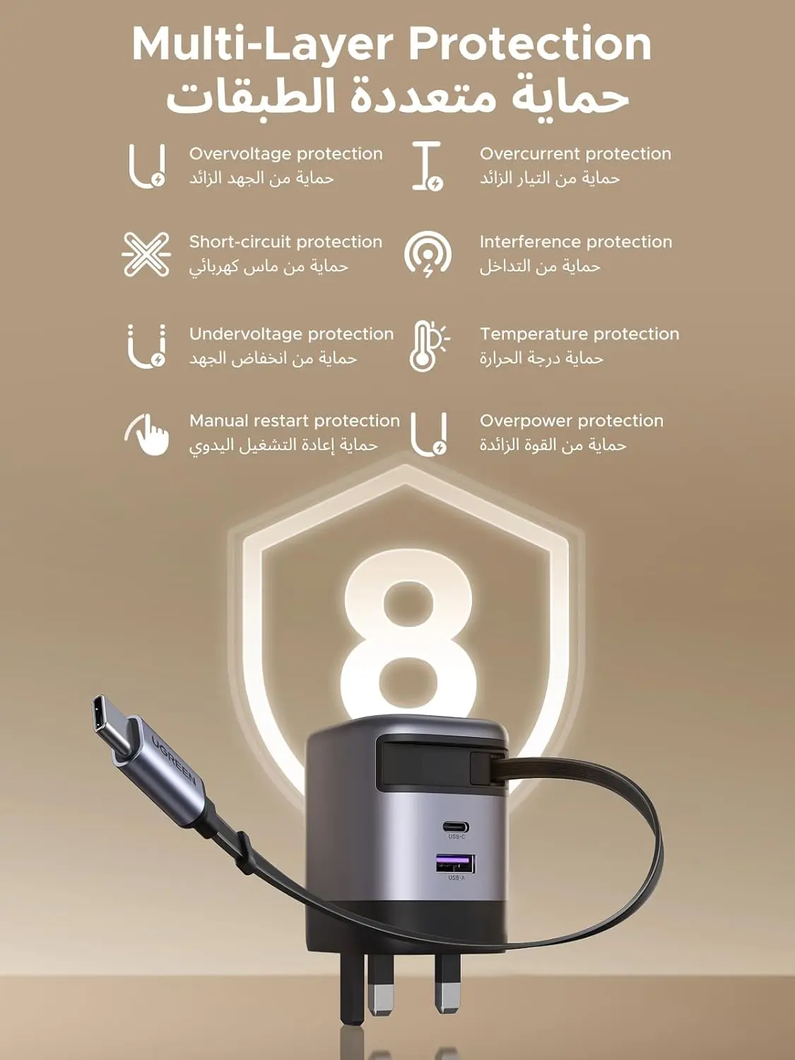 - 【65W Max Superior Fast Charging】This fast Type-C charger features a retractable USB-C cable and 1 USB-C & USB-A Port, and in just 30 minutes can power your iPhone 16 to 56% or MacBook Air 13” M4 to 48%. The USB-C port supports Super Fast Charging 2.0 (65W), while the USB-A port provides 22.5W Max Fast Charging for wider compatibility.