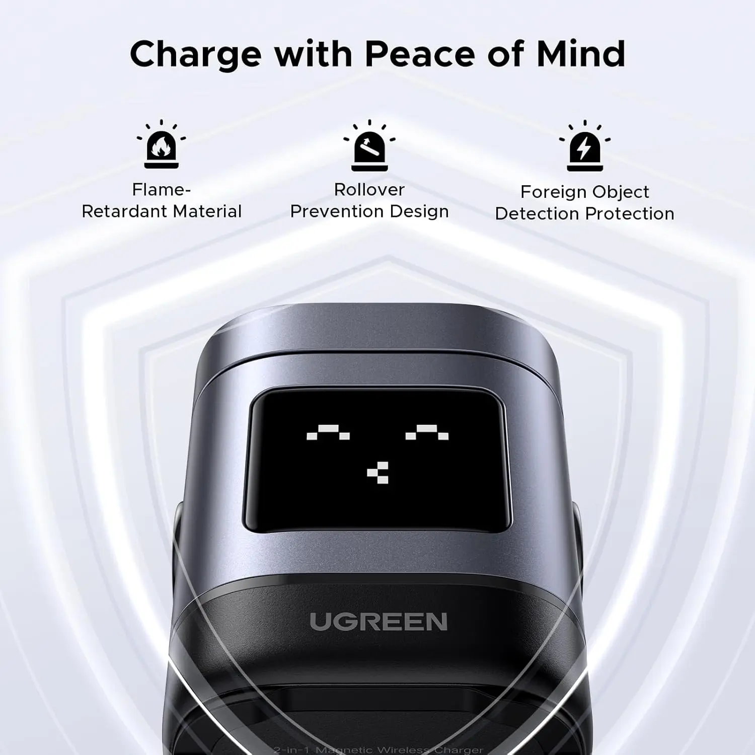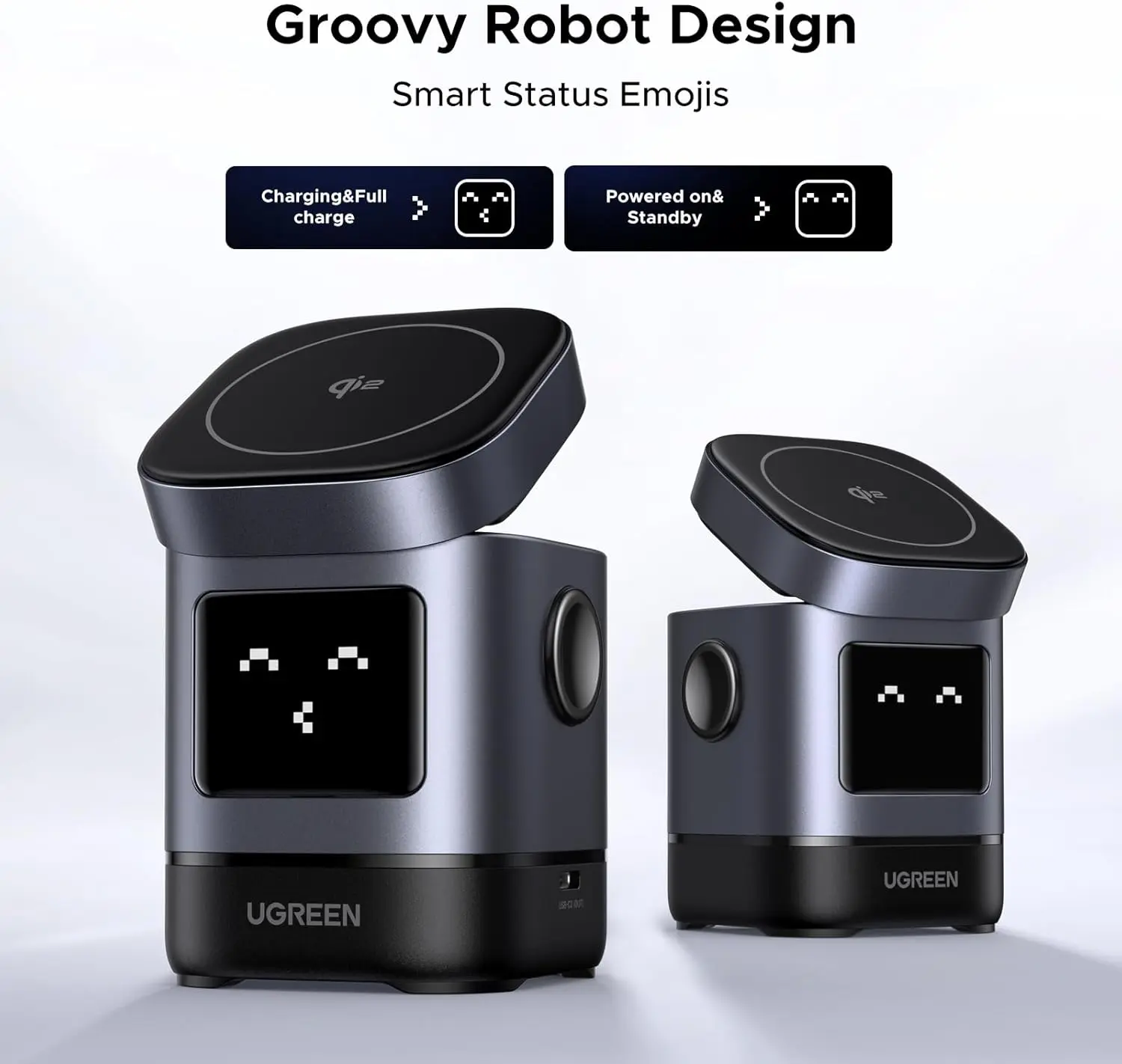 UGREEN Uno Wireless Charger: UGREEN creative series wireless charger, a robot shape, and an upgraded LED smart status emoji display, so it shows more interesting different expressions depending on the charging status.