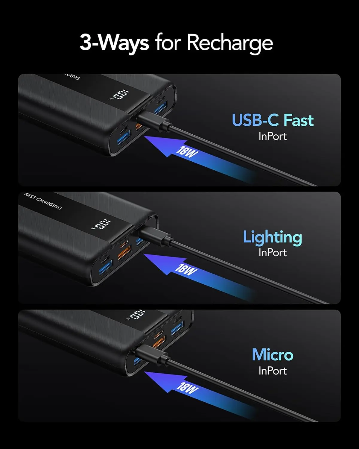 - [Multiple Input and Output Ports] The mobile power bank adopts a multi-port design, with 3 USB output ports (the blue USB port is for normal charging, the yellow USB port supports fast charging), Micro and IOS input ports, and the Type-C input and output port, power bank 20000mAh can meet most of the charging needs of daily life.
