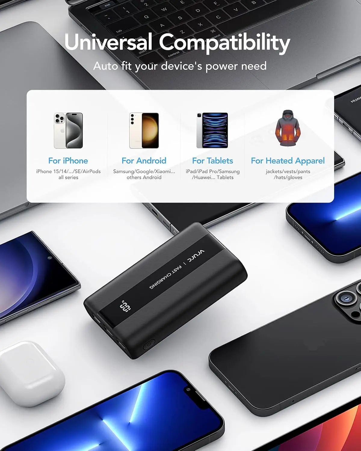 - [22.5W Fast Charging] The USB port of the mobile phone charger bank has a fast-charging power of up to 22.5W, which is compatible with most mainstream devices on the market, such as PD, QC, and Huawei SuperCharge, etc.